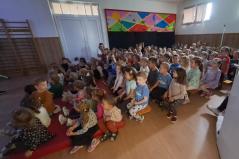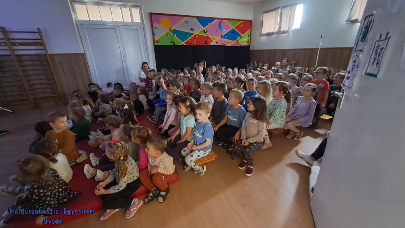A héten ellátogattak hozzánk a VIDÁM VÁNDOROK. A zenés meséket előadó társulat már hosszú évtizedek óta szívesen meghívott vendég óvodánkban; most is kitűnő hangulatot teremtettek. Túl az esztétikusan feldolgozott és digitálisan levetített interaktív szervezésben történő mesélésen, fülbemászó, könnyen megtanulható dalocskákat és ismert gyermekdalokat is hallhattunk előadásukban.